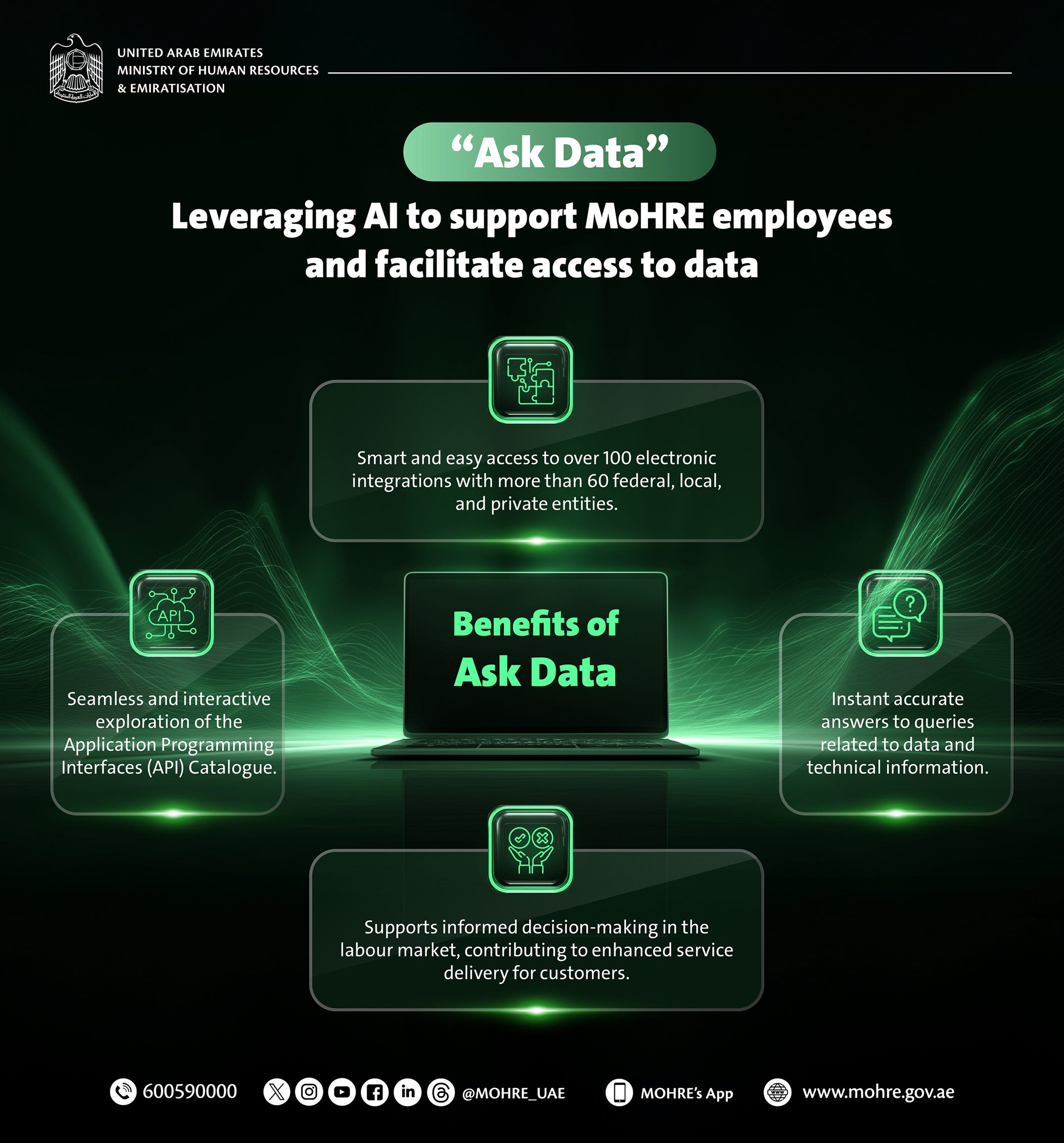 UAE Ministry of Human Resources and Emiratisation (MoHRE) unveiled its Ask Data initiative, which aims to support MoHRE employees, facilitate access to data, and enable informed decision-making in the labour market. See MoHRE