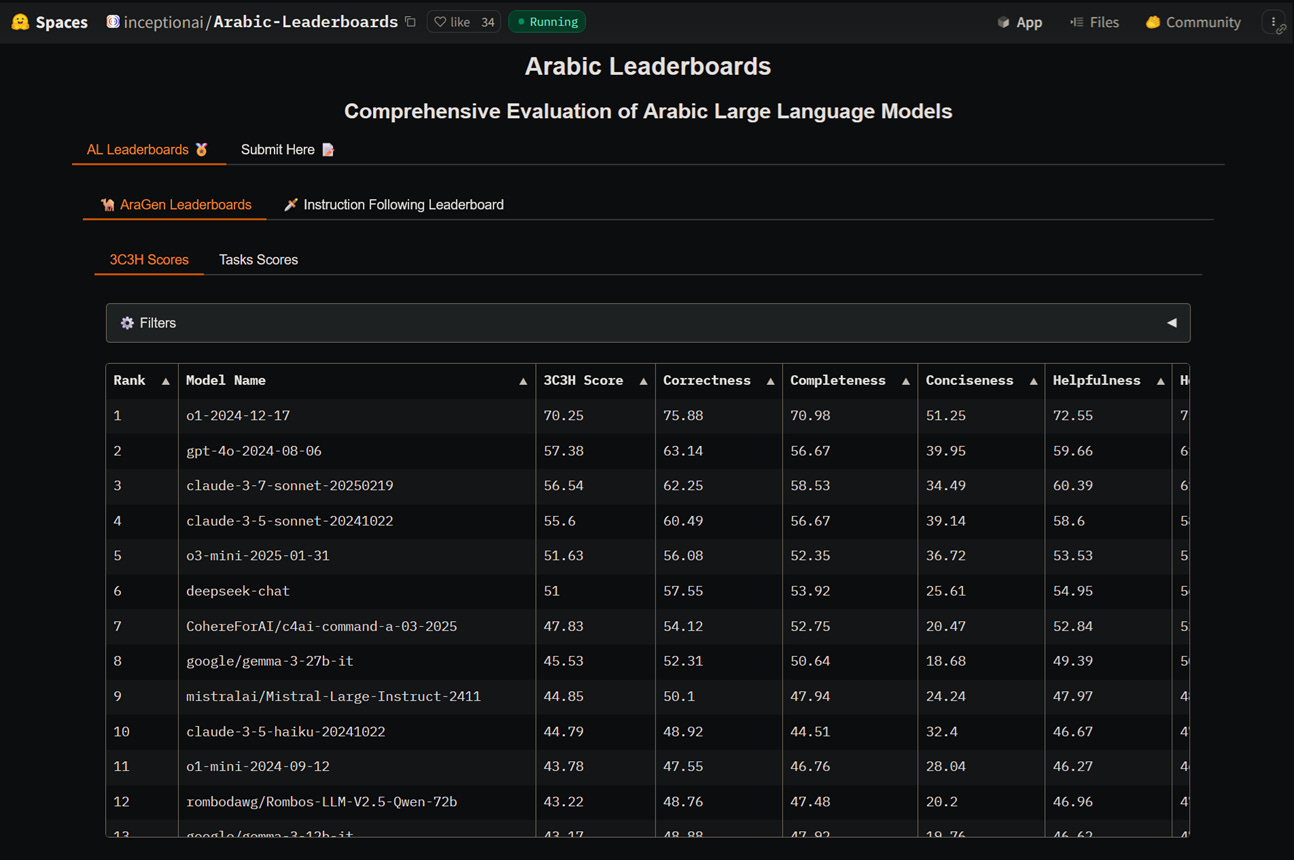 In addition, the launch of AraGen (now found in the new Arabic Leaderboards Space by Inception, MBZUAI, and Hugging Face in December 2024, offers a holistic approach to evaluation. AraGen’s new 3C3H Measure introduced a comprehensive framework evaluating six dimensions: Correctness, Completeness, Conciseness, Helpfulness, Honesty, and Harmlessness.