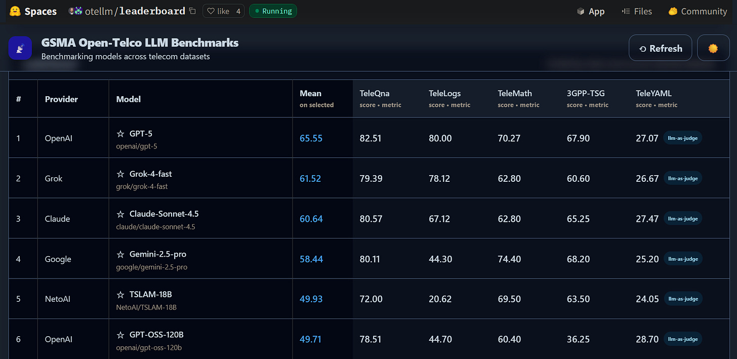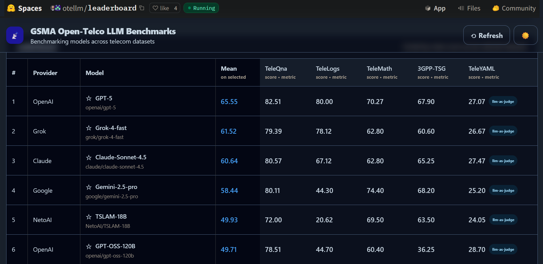 The benchmarks rigorously assesses AI models on telecom-specific knowledge including 5G core network configuration generation, root-cause analysis from network logs, mathematical reasoning for engineering calculations, and standards comprehension. Results show general-purpose frontier models including GPT-5, Grok-4-fast and Claude Sonnet 4.5 lead overall performance, whilst domain-tuned models demonstrate competitive results on specialised tasks.