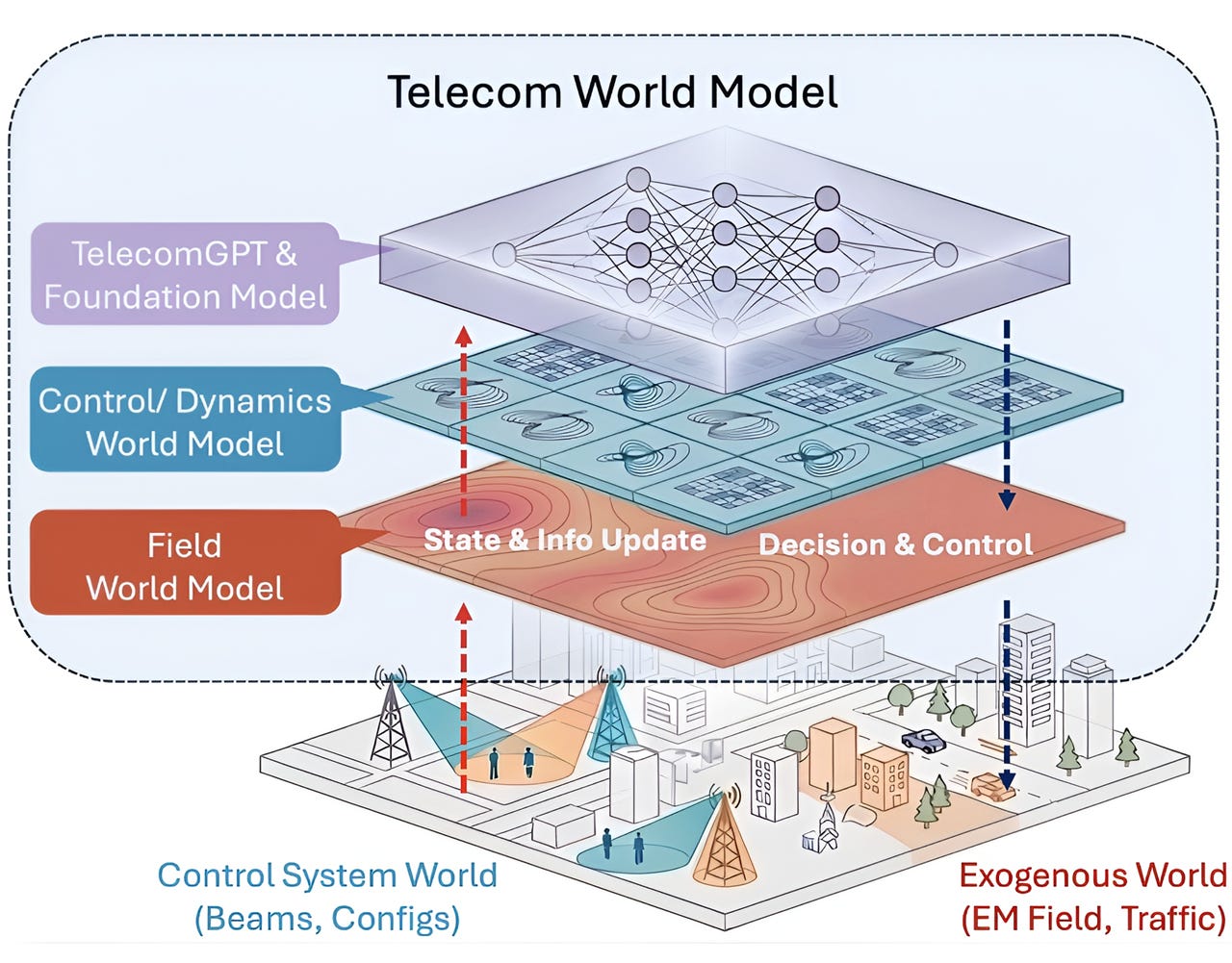 The architecture separates network dynamics into three interacting layers: a Field World Model for spatial environment prediction, a Control and Dynamics World Model for forecasting key performance indicators based on control actions, and a Telecom Foundation Model layer for intent translation and orchestration.
