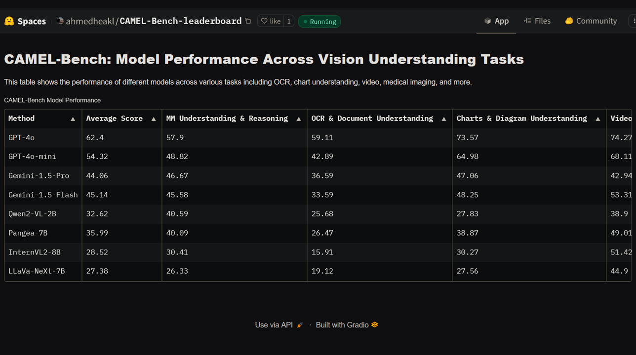 A new leaderboard for a proposed benchmark for evaluating large multi-modal models (LMMs) called CAMEL-Bench, was pushed live on open-source AI community community Hugging Face this week. The comprehensive Arabic language LMM benchmark is part of the ORYX Library for Large Vision-Language Models curated by Mohammed bin Zayed University of Artificial Intelligence (MBZUAI).