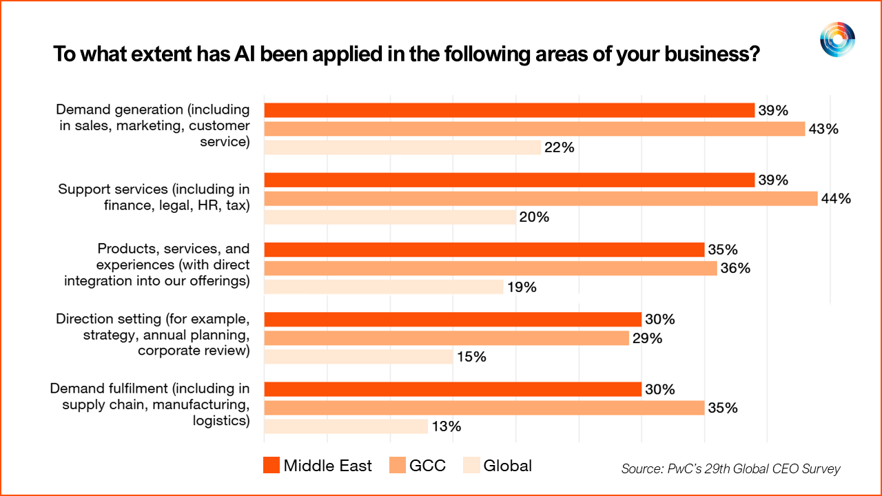 Nearly 40% of Middle East CEOs have adopted AI for demand generation, customer service and support services, significantly ahead of global benchmarks, whilst more than a third of Middle East and GCC leaders report integrating AI directly into their offerings compared with fewer than one in five globally.