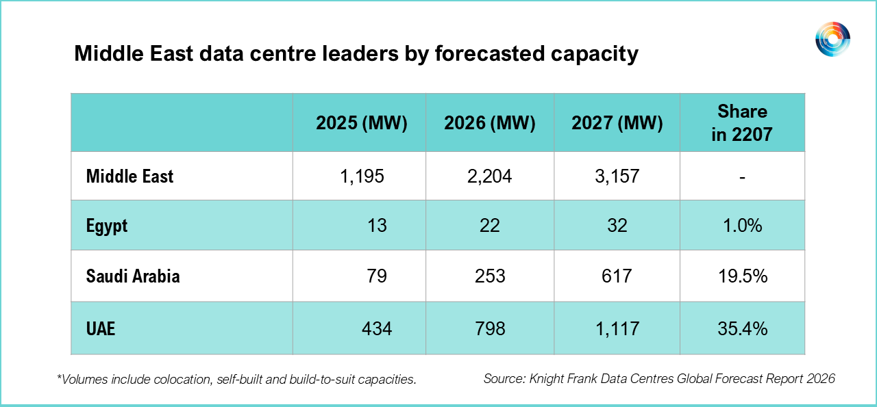 London-based global property consultancy Knight Frank’s Global Data Centres Outlook 2026 forecasts Middle East data centre capacity reaching 2.2GW in 2026 and 3.2GW in 2027, compared with 1.2GW at end of 2025, representing 62.5% annual growth rate.