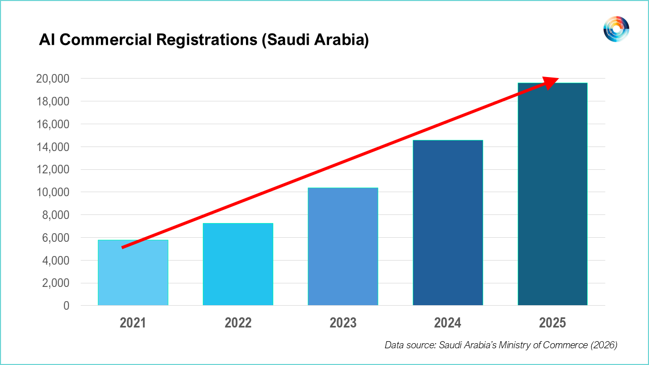 #Saudi #economy - Saudi Arabia’s AI sector reached 19,638 commercial registrations by end-2025, up 240 percent from 2021, according to new data from the Ministry of Commerce. Growth reflects strong policy momentum, alongside national training programmes and increasing private sector alignment with Vision 2030. Saudi Arabia has designated 2026 as the Year of Artificial Intelligence, (Middle East AI News)