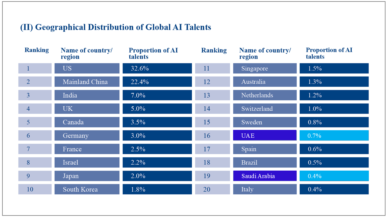 #SaudiArabia #UAE #talent - Saudi Arabia and the United Arab Emirates have secured positions among the world's top 20 nations for AI talent density, surpassing Italy and Russia according to the latest Global AI Competitiveness Index from Beijing-based International Finance Forum and AI research firm Deep Knowledge Group. Ranked 19th globally Saudi Arabia now holds 0.4% of global AI talent, whilst in 16th place, the UAE accounts for 0.7% of global AI talent. The report uses an estimate of 3 million people as the total global AI talent pool.