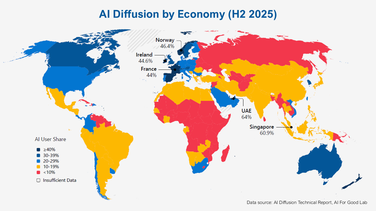 Singapore holds second place globally with 60.9 percent adoption, followed by Norway, Ireland, France and Spain, showing that strong infrastructure, policy coordination and digital readiness can drive rapid adoption without requiring frontier-level model development or massive datacentre capacity.